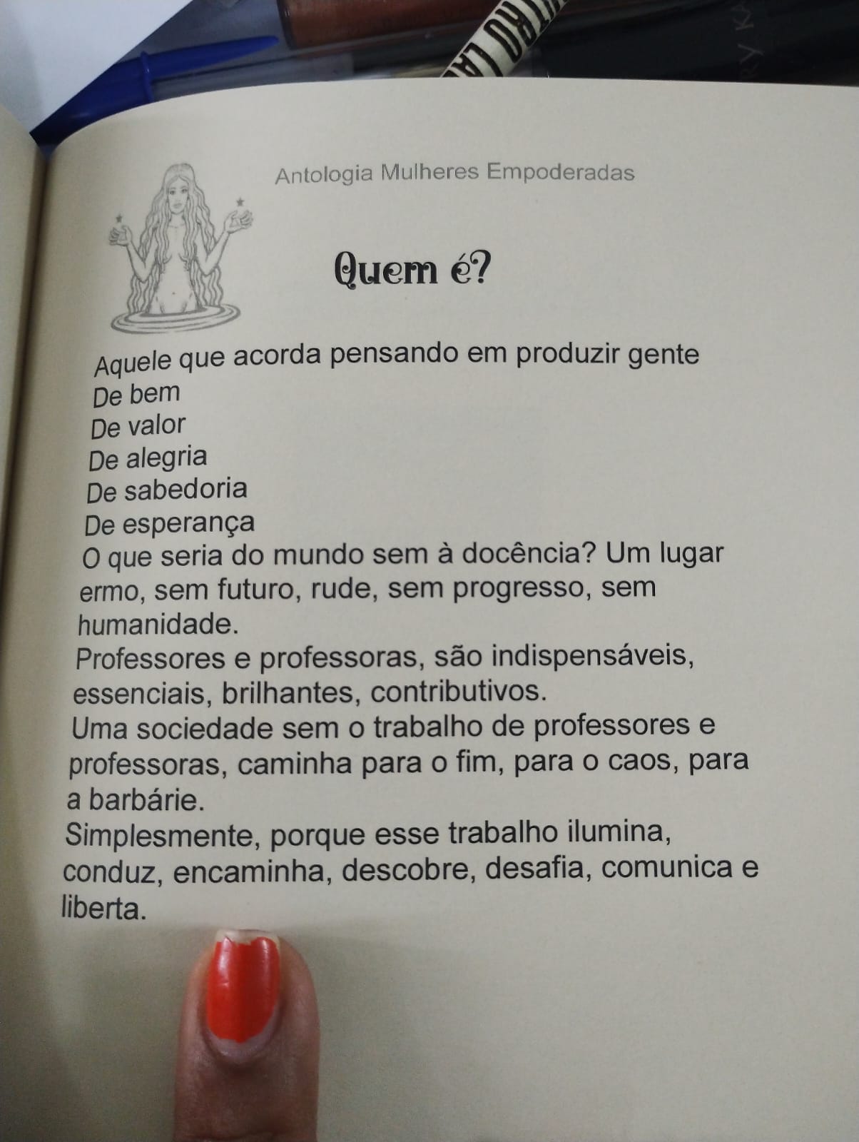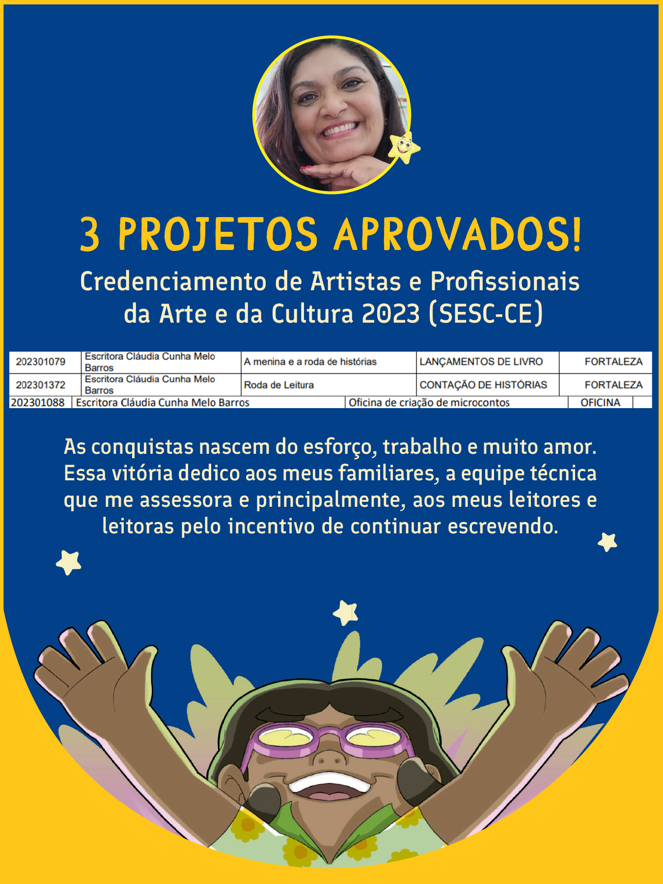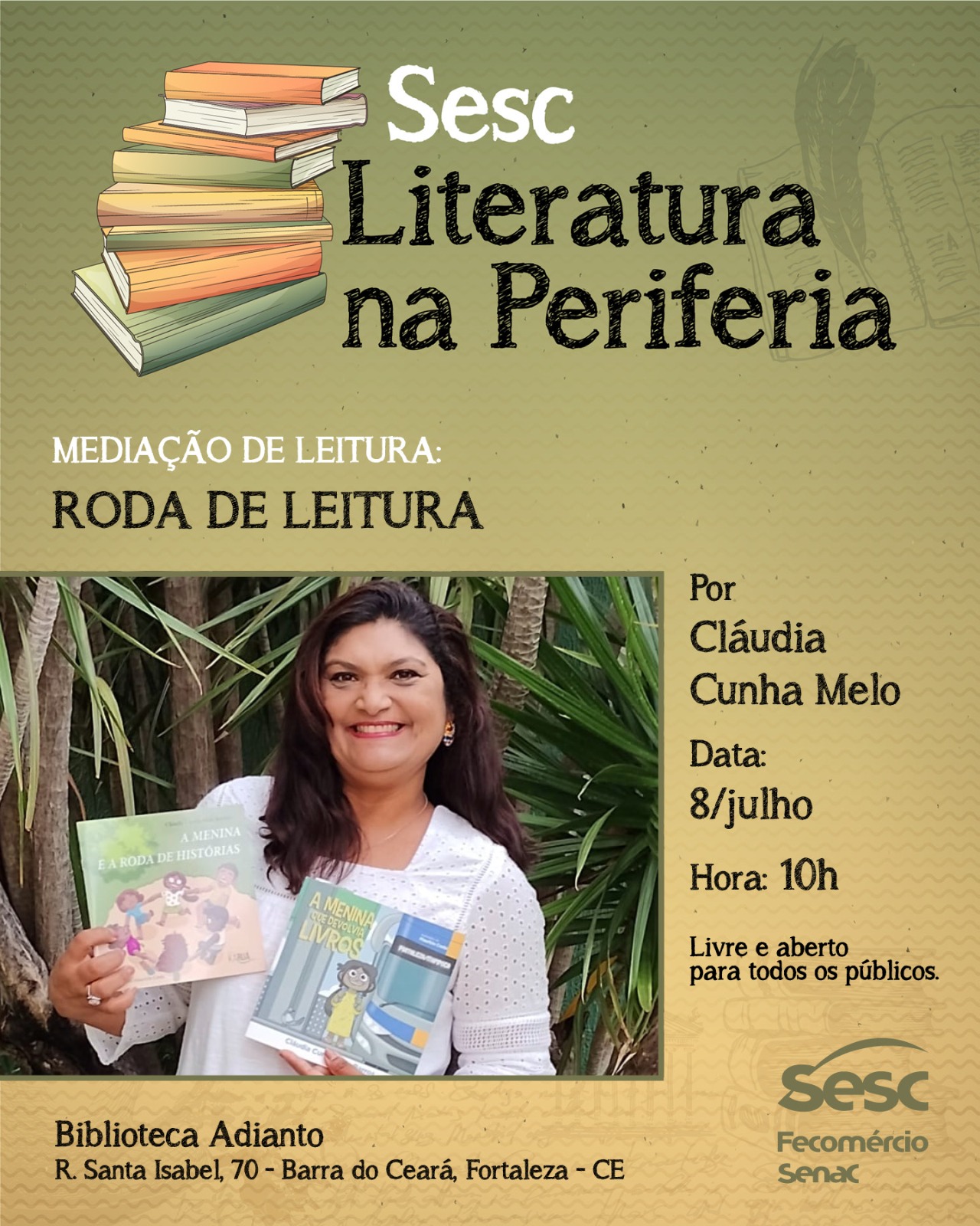 Sou professora e amo minha profissão! Sou escritora e leitora, faço questão de disseminar a valorização do livro, da poesia, do cordel, da produção local. Sei o quanto o livro tem sido negado à população em geral. É importante que a cultura leitora se transforme num direito de todos (as) e para todos (as)