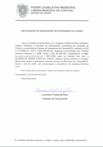 O Grupo Quadrilha Junino Fiapo de Trapo, de artes culturais Integradas é um dos principais Grupos Culturais juninos do Estado do Ceará, situado no Município de Cascavel, na Região Litoral Leste do Estado e que a 17 anos, desenvolve e matém vivo a chama cultural da arte junina, através dos folguedos e manifestações tradicionais populares cearense. Quadrilha Junina Fiapo de Trapo, fundada em 06 de janeiro de 2006, Filiada a Federação das Quadrilhas Juninas do estado Ceará – FEQUAJUCE, sob o código de n.°AI 028/2006, representada por Marcos Antonio Pereira da Silva, hoje o Grupo Junino é filiado À União Junina do Ceará, tem como Presidente Thiago Silva Santos.