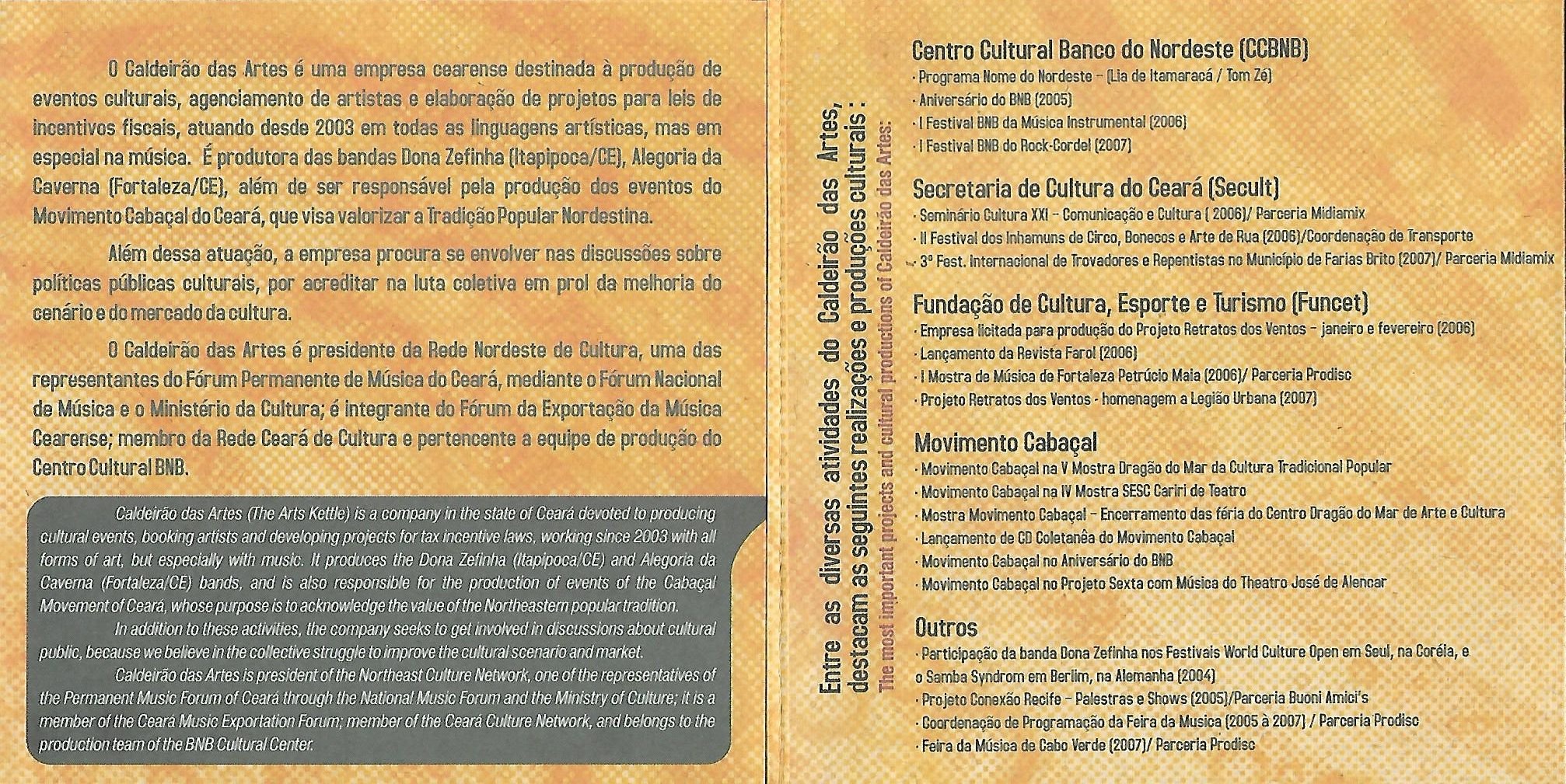 O Caldeirão das Artes é uma empresa cearense destinada à produção de eventos culturais, agenciamento de artistas e elaboração de projetos para leis de incentivos fiscais, atuando desde 2003 em todas as linguagens artísticas, mas em especial na música e na cultura popular.