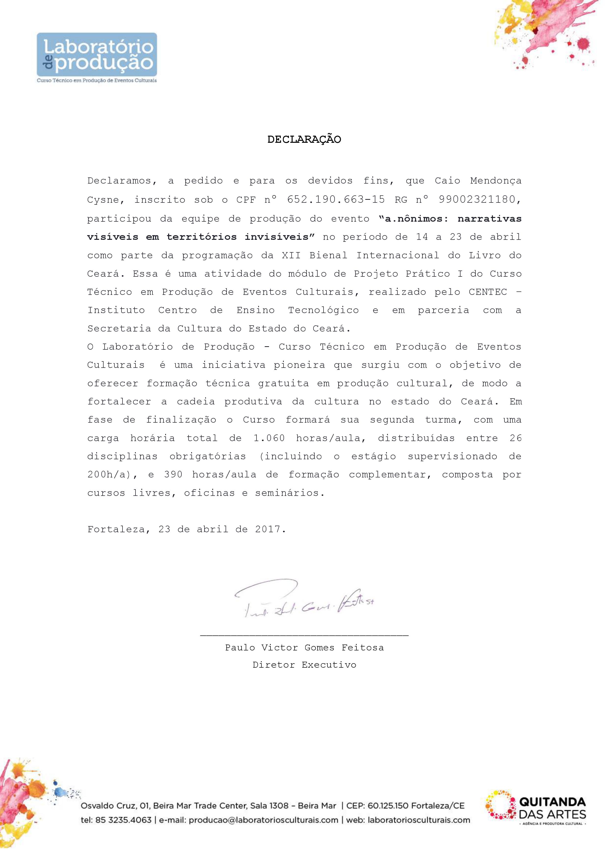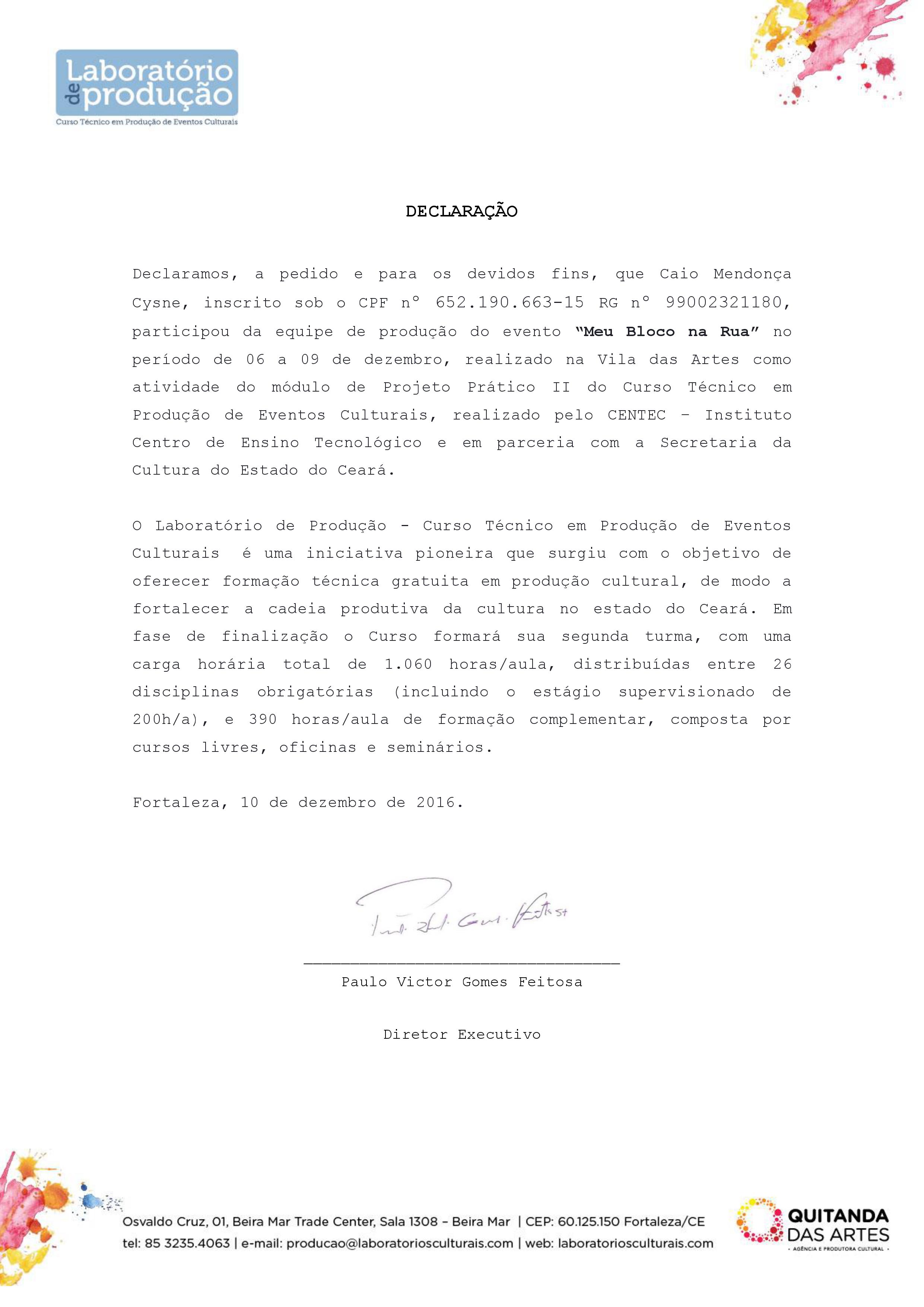 Pós graduado em Gestão Cultural pela Universidade Estadual do Vale do Acaraú; Especialista em Teorias da Comunicação e da Imagem, pela Universidade Federal do Ceará (UFC); Graduando em Jornalismo pela Universidade Federal do Ceará (UFC); Graduado em Gestão Desportiva e de Lazer pelo Instituto Federal do Ceará (IFCE); Técnico em Produção de Eventos Culturais. Tem larga experiência em produção de eventos culturais nas mais diversas linguagens e recentemente trabalhou como Social Media no Centro Cultural Grande Bom Jardim (CCBJ).