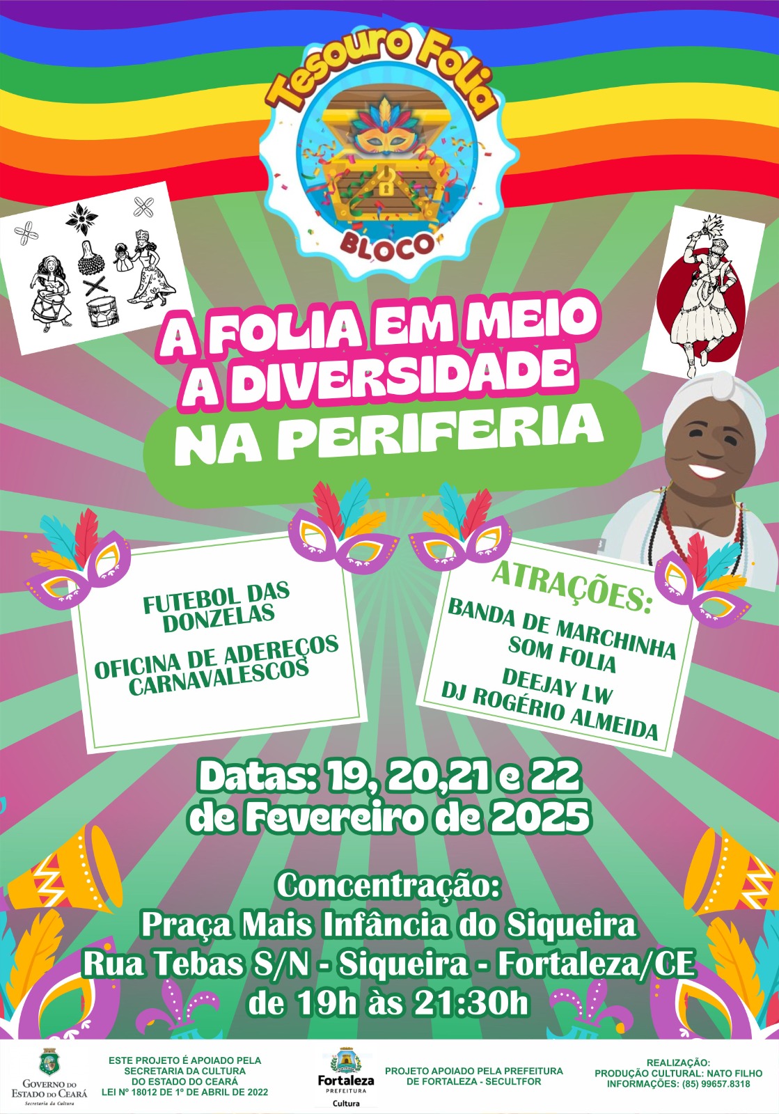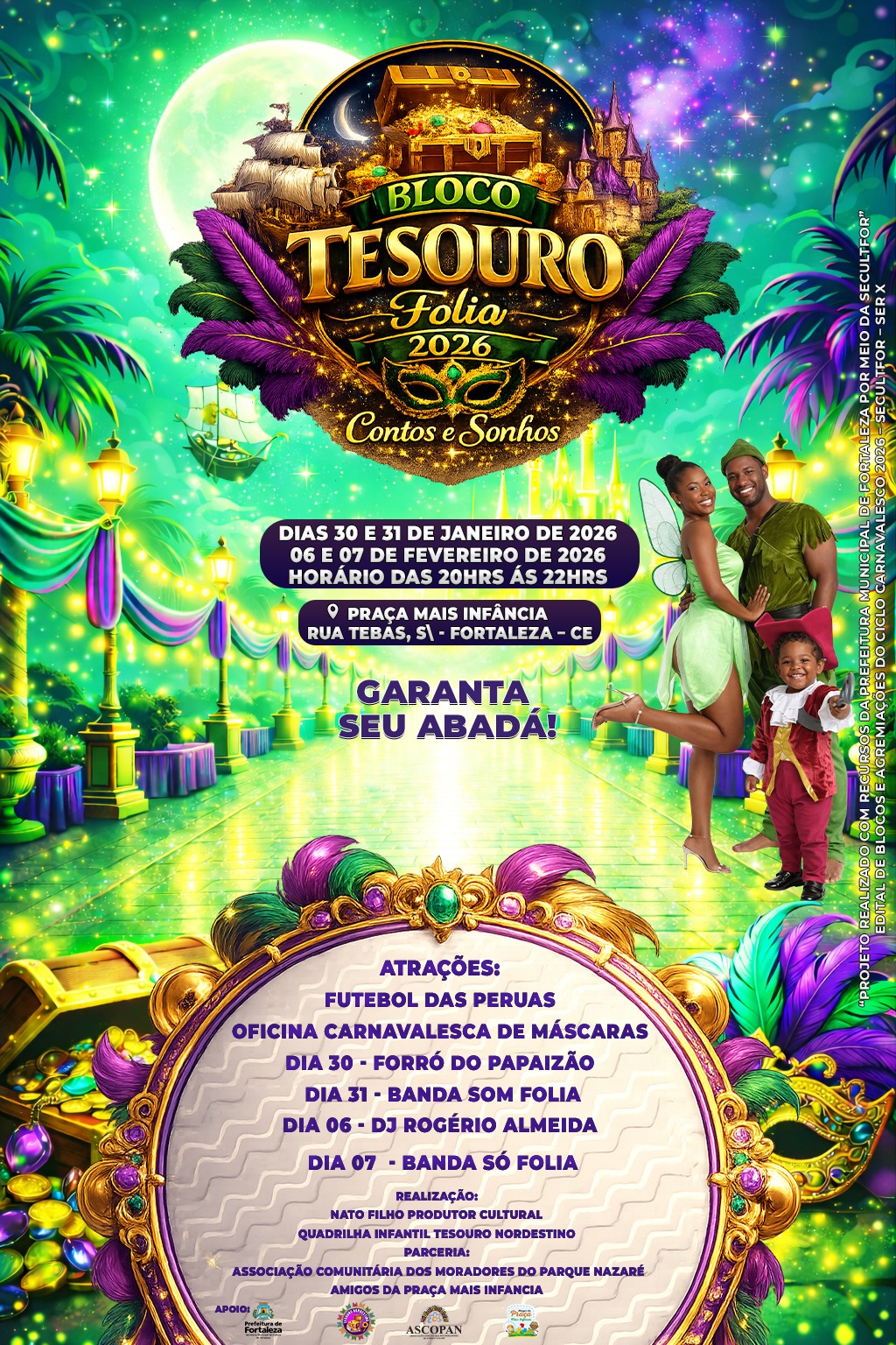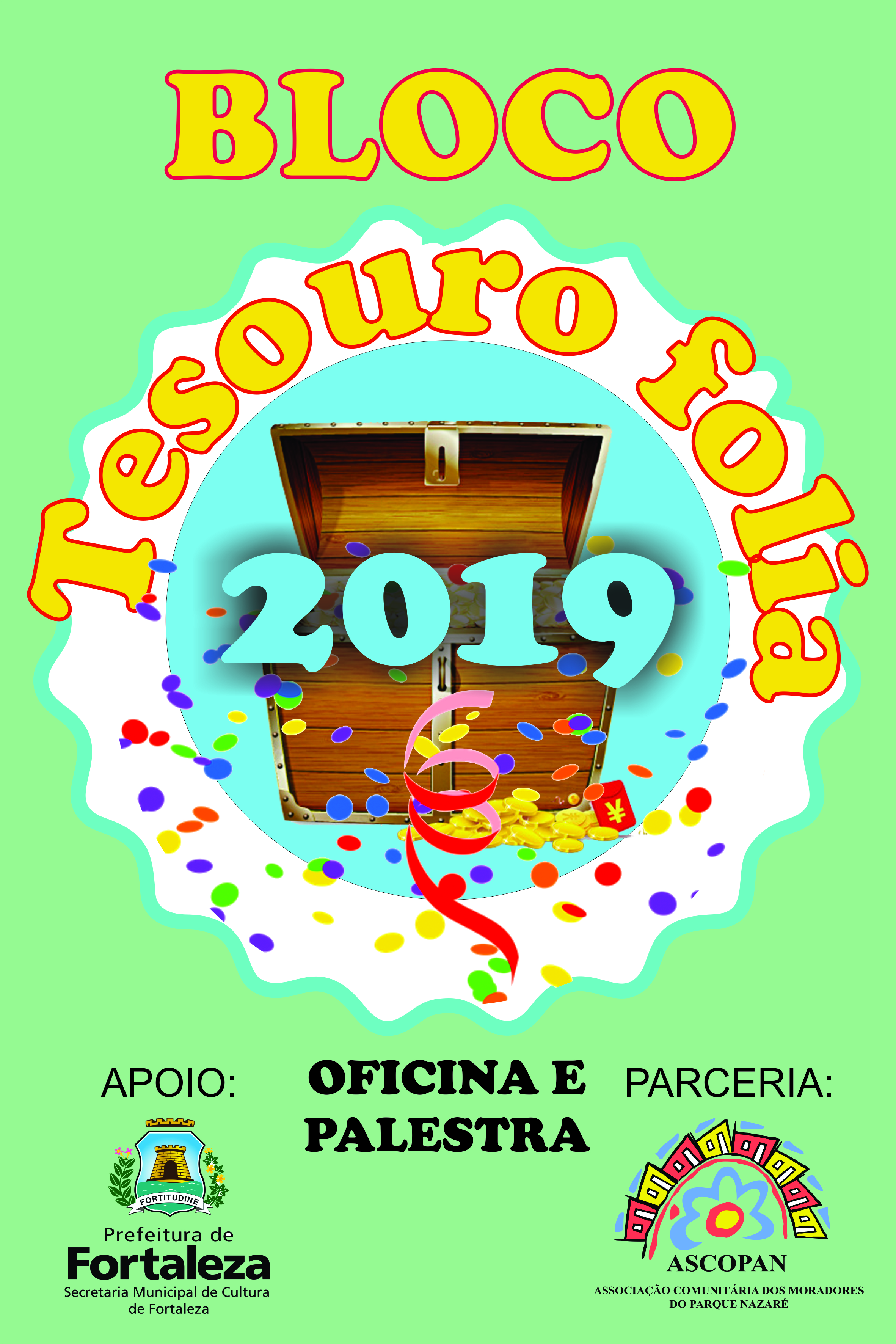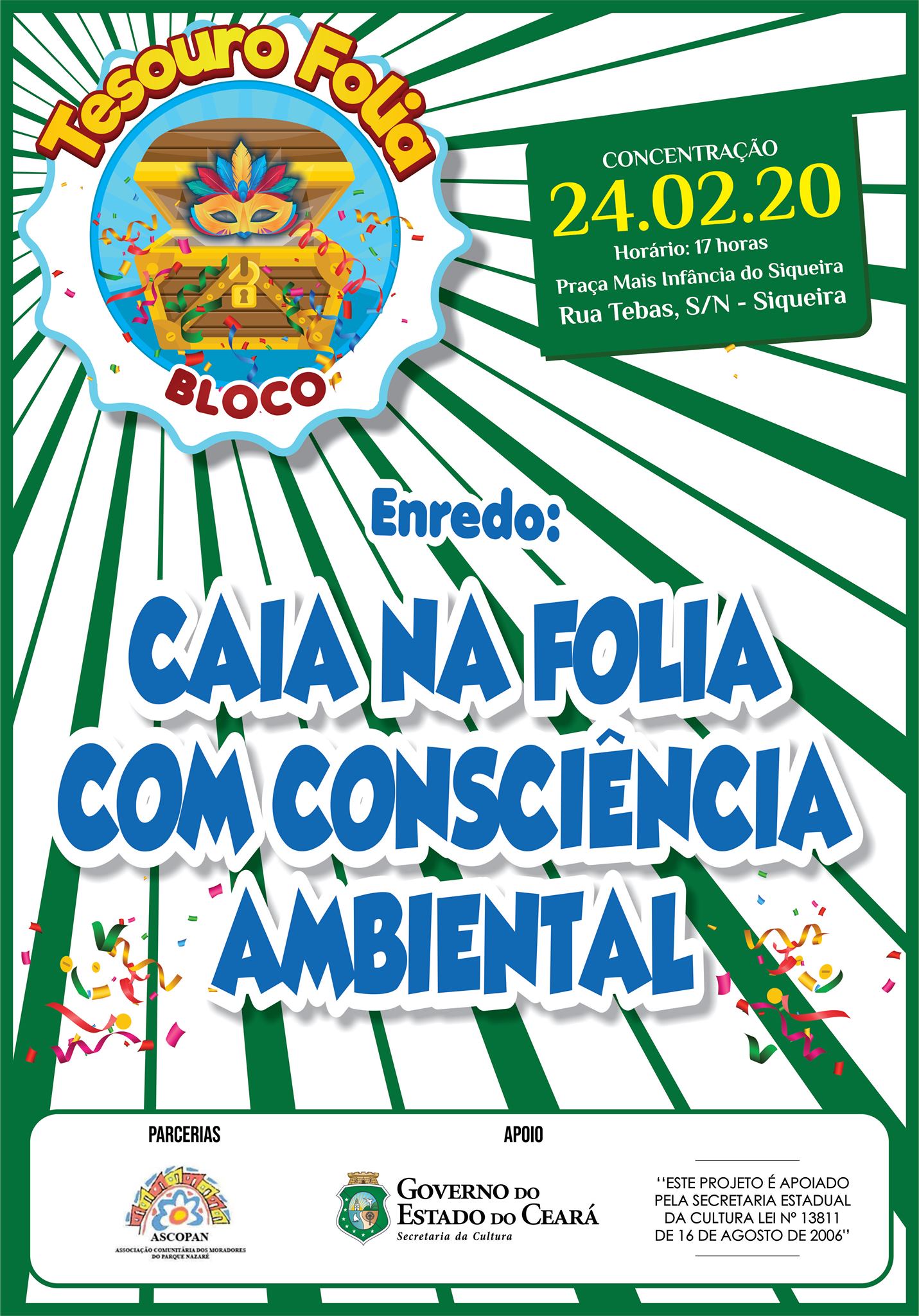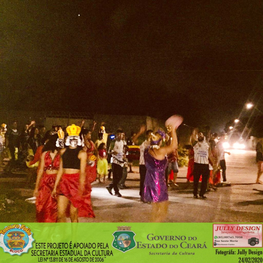 A AGREMIAÇÃO CARNAVALESCA BLOCO TESOURO FOLIA, NASCEU EM 2011, COM ATIVIDADE DE INTEGRAÇÃO DA COMUNIDADE DO PARQUE NAZARÉ NO BAIRRO SIQUEIRA 2, TENDO COMO SEU PRINCIPAL OBJETIVO CRIAR MEIOS DE APRECIAÇÃO E CONVIVIO SOCIAL PARA A POPULAÇÃO E BAIRROS VIZINHOS, TENDO CONHECIMENTO DAS PRATICAS E SABERES DAS DIVERSAS FOLIAS E FOLGUEDOS DO CARNAVAL CEARENSE, TENDO SEU PRIMEIRO DESFILE ACONTECIDO NA RUA GOMES SAMPAIO NO ANO DE 2011, AGREGANDO CERCA DE 100 BRINCANTES, DEVIDAMENTE FANTASIADOS COM O ENREDO FALANDO SOBRE A PAZ NO CARNAVAL, ATUALMENTE NOSSA AGREMIAÇÃO SI CONSOLIDA E A CADA ANO VAMOS CRIANDO NOVOS ENREDOS QUE VISAM ESTIMULAR A MENTE CRITICA DOS NOSSOS BRINCANTES E APRECIADORES, TORNADO A CULTURA CARNAVALESCA PRESENTE EM NOSSA HUMILDE PERIFERIA, DANDO ENTRETENIMENTO PARA O PUBLICO ADULTO, IDOSO, CRIANÇAS E ADOLESCENTES.