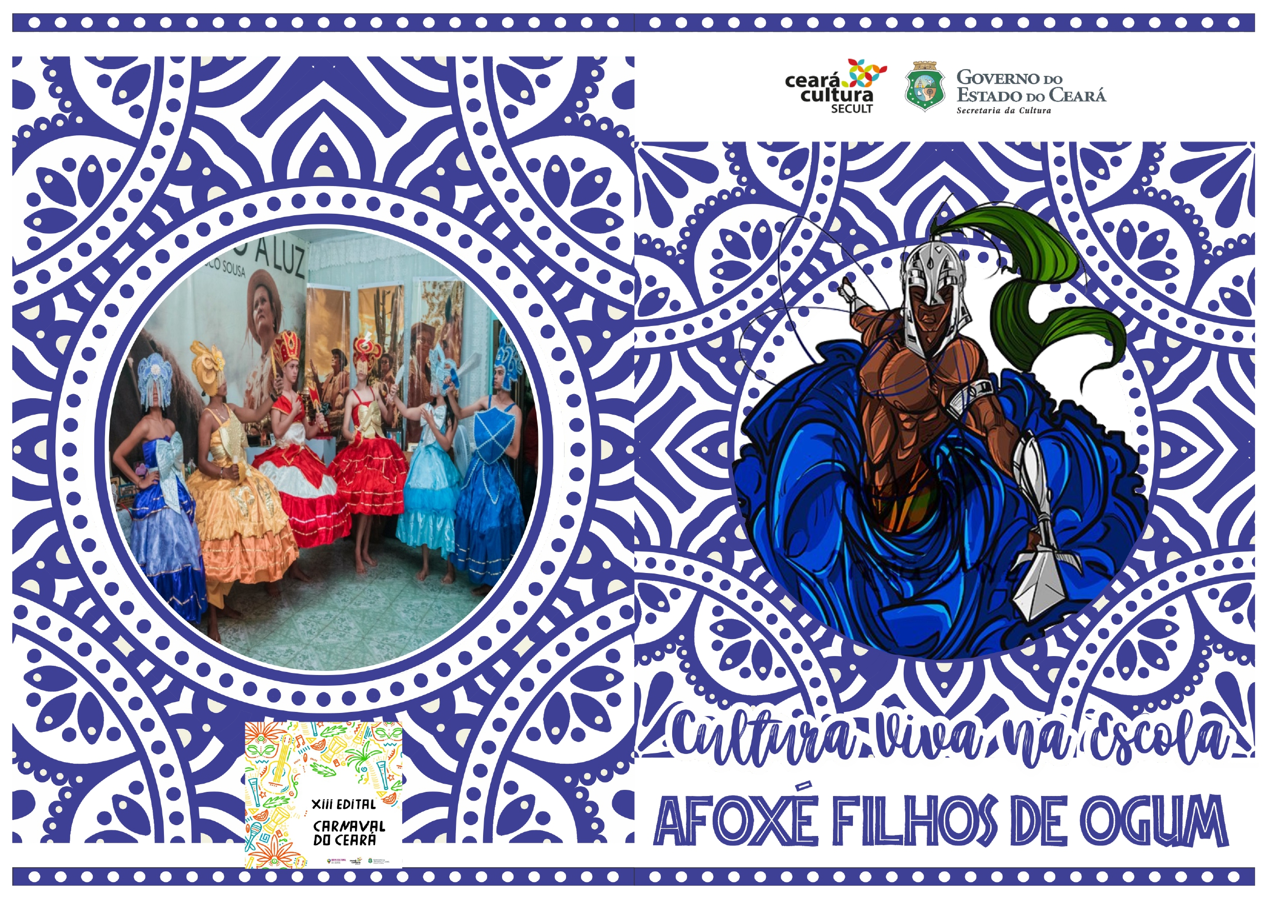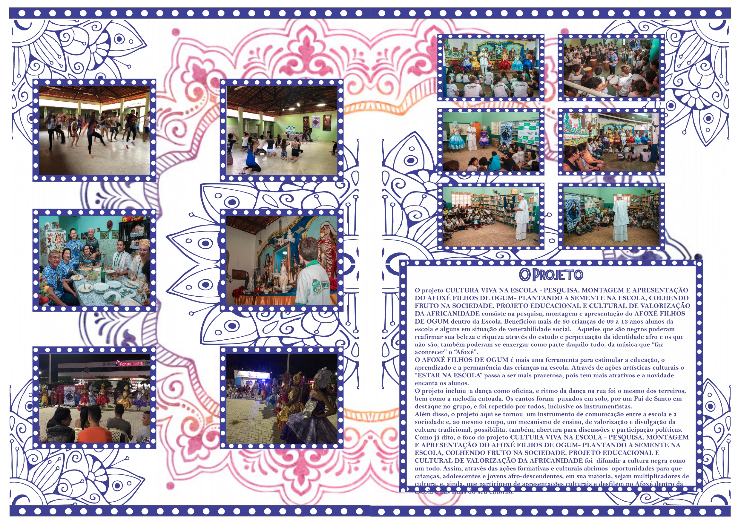 AFOXÉ FILHOS DE OGUM 2019 - PLANTANDO A SEMENTE NA ESCOLA, COLHENDO FRUTO NA SOCIEDADE. PROJETO EDUCACIONAL E CULTURAL DE VALORIZAÇÃO DA AFRICANIDADE. O projeto beneficiará mais de 50 crianças de 09 a 13 anos em situação de venerabilidade social. Aqueles que são negros poderão reafirmar sua beleza e riqueza através do estudo e perpetuação da identidade afro e os que não são, também poderão se enxergar como parte daquilo tudo, da música que “faz acontecer” o “Afoxé”. As oficinas estarão sendo realizadas na Escola Municipal Maria Aglaê. A grande culminância será um desfile do candomblé de rua, vestidos e munidos de instrumentos do Afoxé.