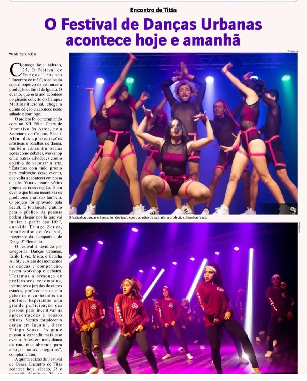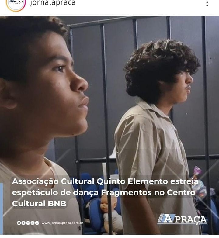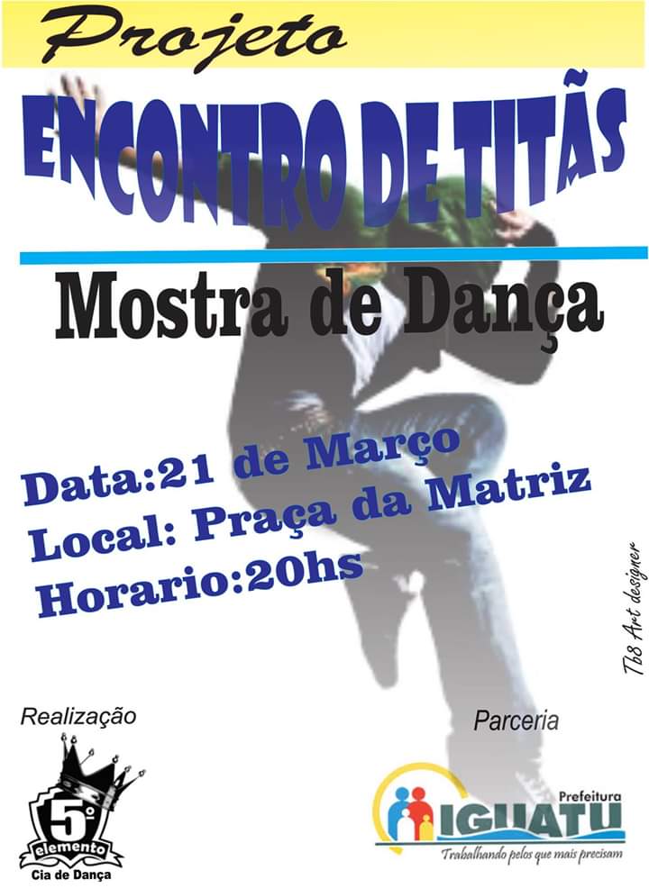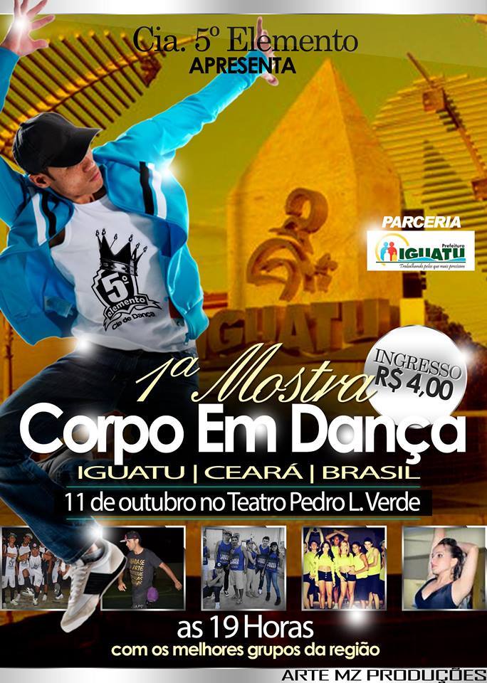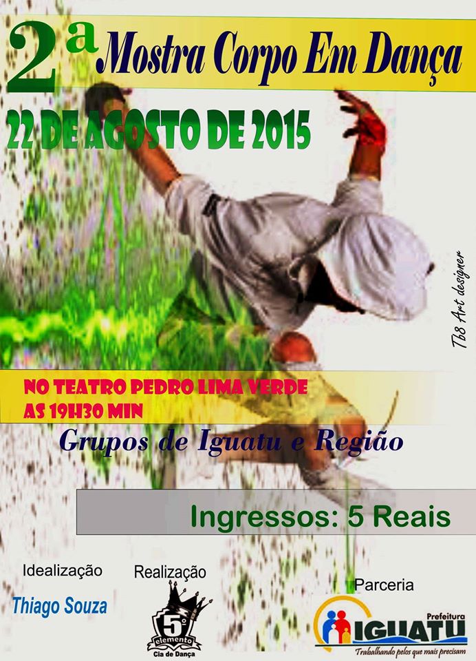 Thiago Souza atua o mundo da dança há 21 anos, e nessa caminhada já participou de vários momentos que elevou seu potencial artístico, desde cursos, palestras e workshops. Participou de vários grupos de dança como: os Garotos de Rua, Grupo Os Boys, Grupo Nossa Cara, Grupo Tropa de Choque. Também nesse período em participações em festivais teve grande destaque a nível nordeste, onde ganhou vários prêmios entre eles; melhor dançarino, melhor diretor artístico, melhor coreografo e vários prêmios de 1° lugar em festivais de renome. Atualmente é diretor e coreografo da cia de Dança 5° Elemento e Funcionário Público municipal da cidade de Iguatu Ceará como Facilitador Dança na Secretaria de Cultura do mesmo município.Vídeos