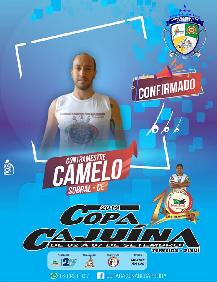 Contramestre Camelo capoeirista com mais de 23 anos de prática no ensino/aprendizagem da capoeira. Responsável pelo trabalho da Escola Livre Capoeira em Sobral. Desenvolve um trabalho com capoeira e suas manifestações artísticos - culturais no Largos das Dores a mais de 15 anos ocupando o local com treinos e práticas de ensino - aprendizagem da capoeira. Realiza também trabalho de capoeira na Casa 4Portas e um dos responsáveis do coletivo cultural de capoeira que realiza a gestão e a produção do Ponto de Cultura Capoeira Sobral. um dos membros fundadores da Liga Sobralense de Capoeira sendo Vice presidente da entidade e participante do Fórum da Capoeira Sobralense sendo um dos idealizadores. Capoeirista e competidor tendo participação em varias competições a nível nacional como competidor e como jurado.Vídeos