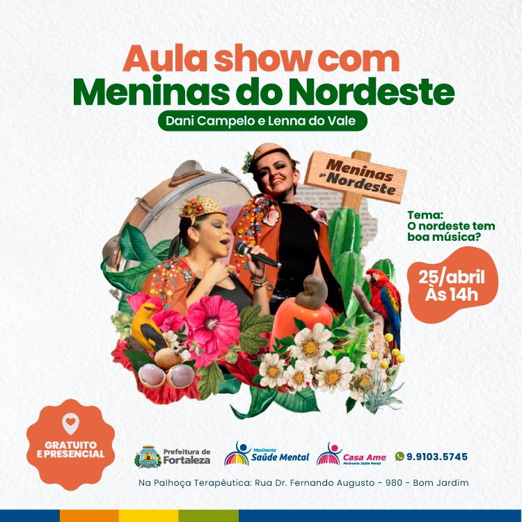 As Meninas do Nordeste, é um mergulho poético na história de vida do povo nordestino, marcada por vitórias, dificuldades e singeleza. Esse conto cantado está projetado para emocionar até os mais distantes e duros corações de visitantes ou amantes desse lugar. Cantar e contar essa história pra nós é uma honra. Reunimos nesse show, grandes clássicos de nossos poetas e poetizas pra que esse registro e esse povo cantador nunca seja esquecido por nós, nossos filhos e por todas as gerações que virão depois. Com duração de 1h30, o show das Meninas do Nordeste, reúne músicos dedicados à execução primorosa e amorosa desse legado cultural que me acompanha. Esse show foi remontado pra contemplar as vozes femininas que se chegaram a partir do grupo de estudo de música nordestina. Nessa chegança veio à força das negras lindas Lenna do Valle e Renata dos Santos que trouxeram muita coisa na mochila e assim ajustamos a proposta para ser cada vez mais criativa, dançante, nordestina, mista e feliz. O show é uma lindeza, trazendo a simplicidade e elegância própria dessa música que vai do violão de 7 cordas ao triangulo com força ancestral e muita alegria. Encontramo-nos em breve “Nos Palcos do Nordeste”!Vídeos