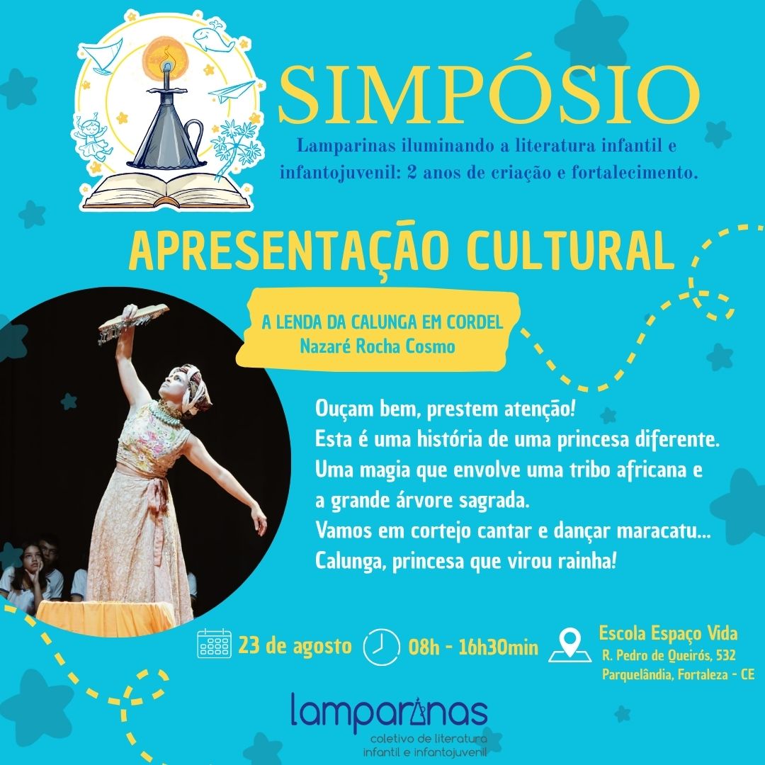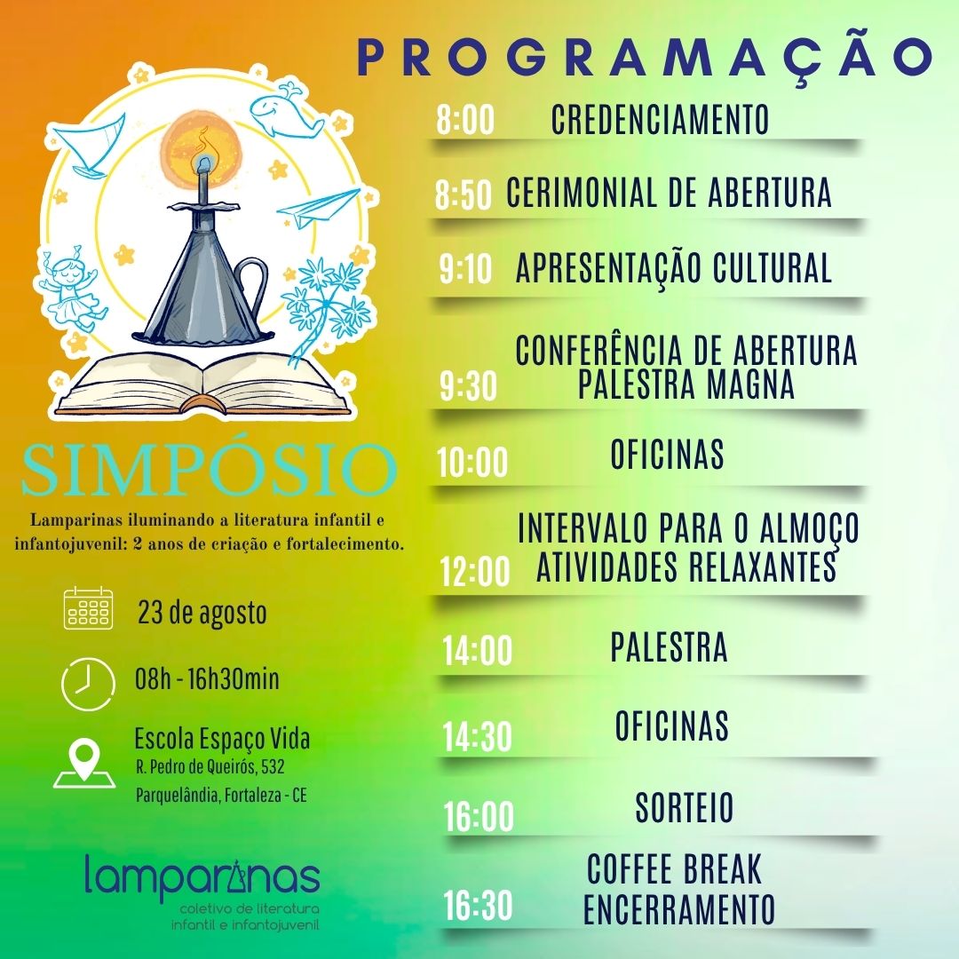 No dia 23 de agosto de 2025, das 8h às 16h30, o Coletivo Lamparinas realizará seu I Simpósio Literário em comemoração aos dois anos de existência do grupo. O evento acontecerá na Escola Espaço Vida, no bairro Parquelândia, em Fortaleza, e reunirá autores, educadores, leitores, artistas e entusiastas das literaturas infantil e infantojuvenil.