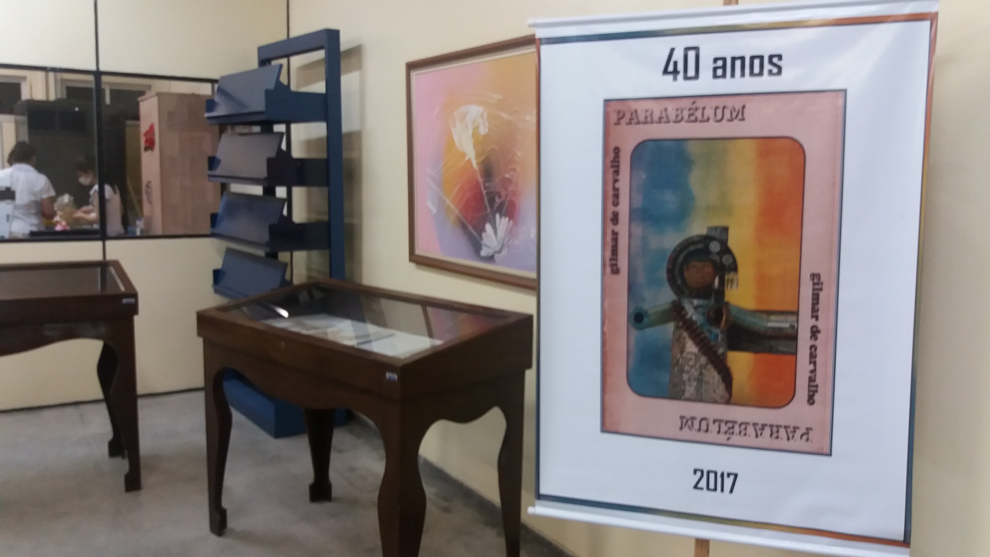 Exposição sobre Parabélum, no salão do primeiro piso da Biblioteca de Ciências Humanas (CH1).