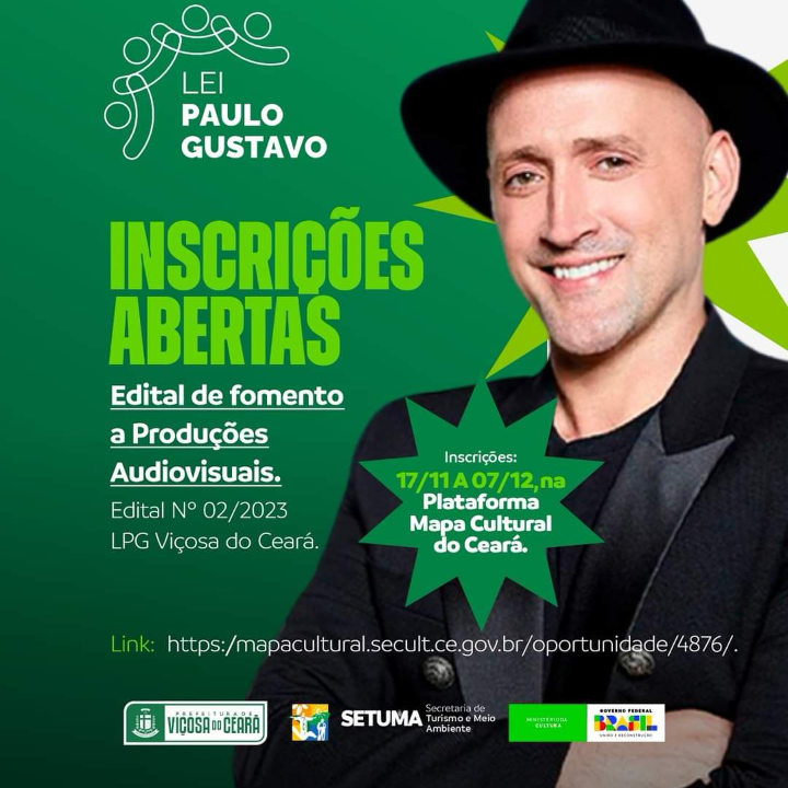 A Prefeitura Municipal de Viçosa do Ceará, por meio da Secretaria de Turismo, Cultura e Meio Ambiente (SETUMA), torna público o Edital de Fomento a Produções Audiovisuais - Lei Paulo Gustavo Viçosa do Ceará - Edital nº 02/2023 - Audiovisual.