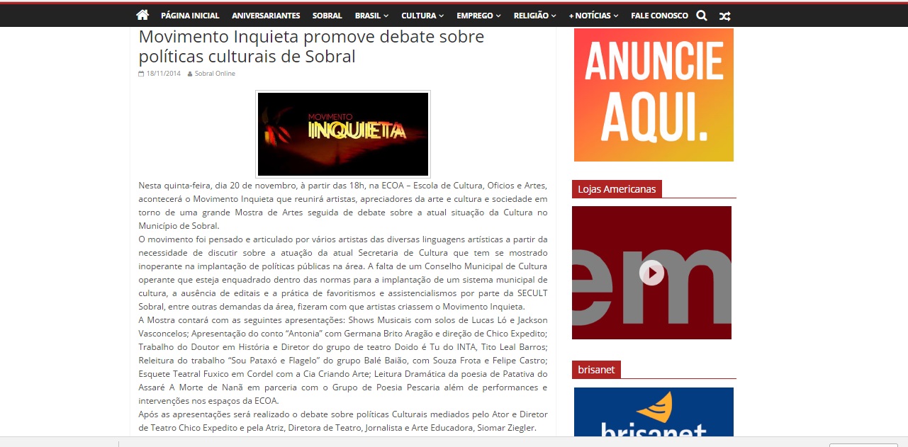 Mostra Inquieta de Artes Integrada foi produzida em 2025 pela Cia. Nós de Dança, realizada em 05 espaços culturais independentes de Sobral, a saber: Biblioteca Comunitária Adalberto Mendes, Casa dos Corres, 4Portas Nambu, Casulo Casa Cultural e 4Portas Margem.A programação foi composta por 02 espetáculos de teatro, 02 performance artísticas, 02 esquetes de dança, 03 exibição audiovisual (doc, curta e videoarte) e 01 show musical.